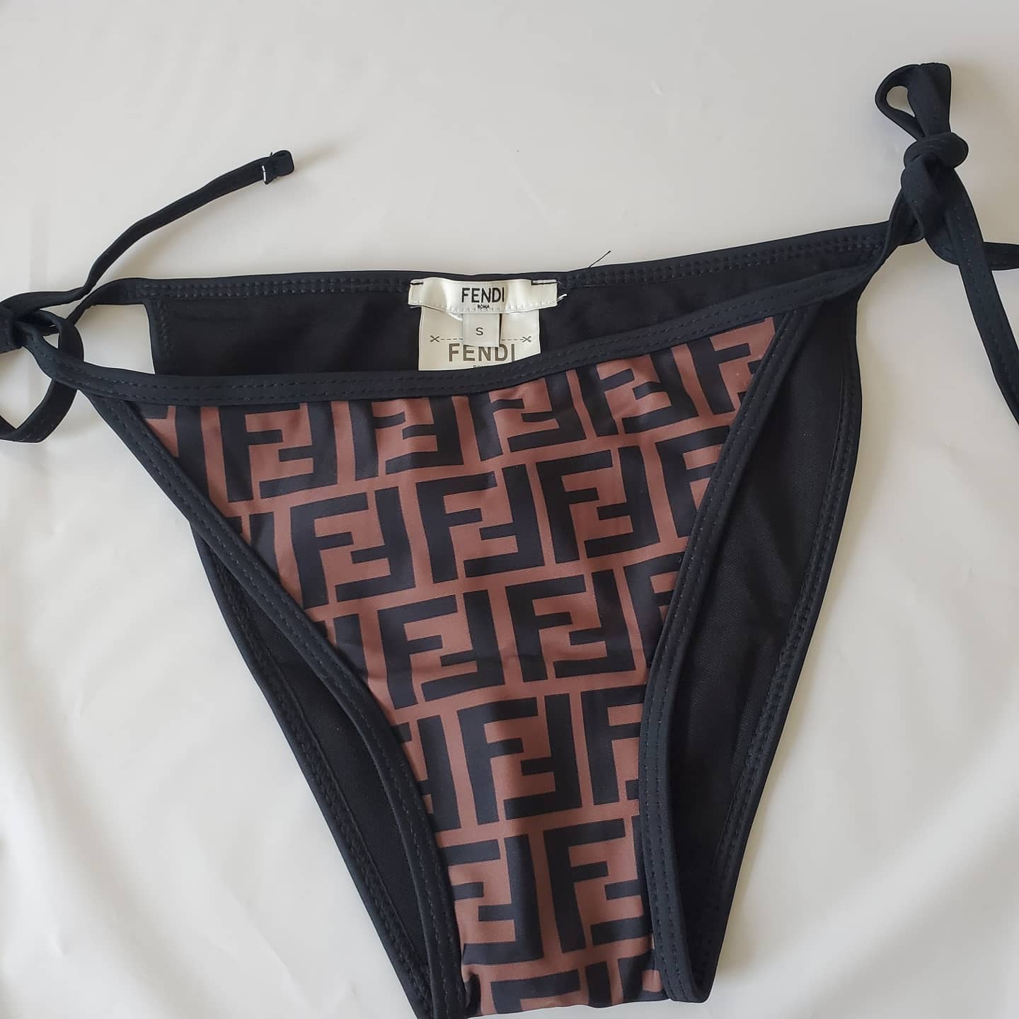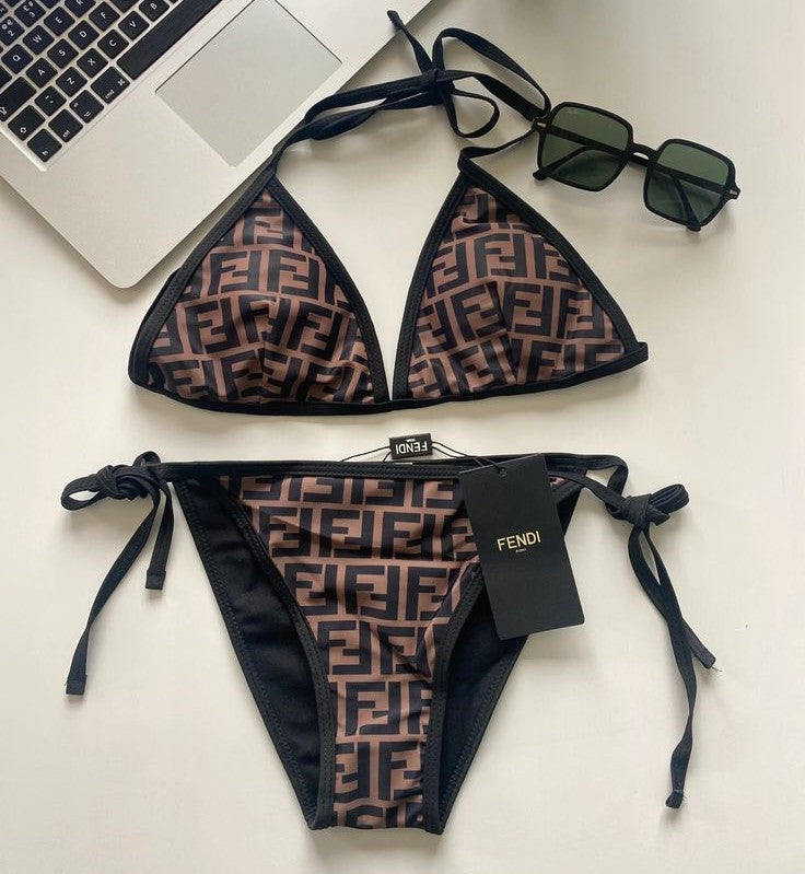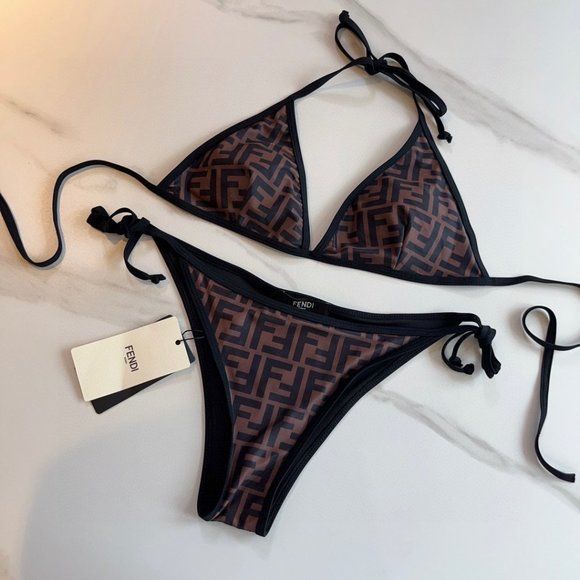 Maillot de bain Fendi deux pièces avec haut triangle et slip avec liens sur les côtés.