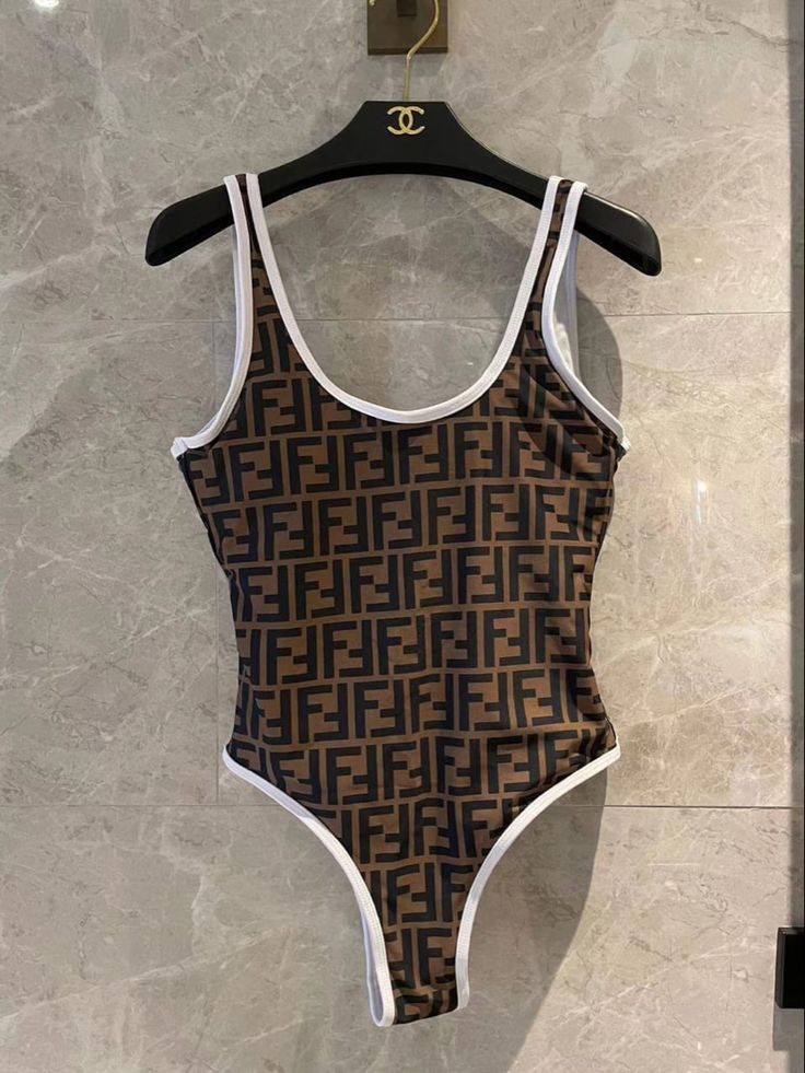 Maillot de bain Fendi une pièce réversible réalisé en Lycra® marron avec motif FF intégral. Poche à cordon de serrage assorti avec logo Fendi sur le devant.